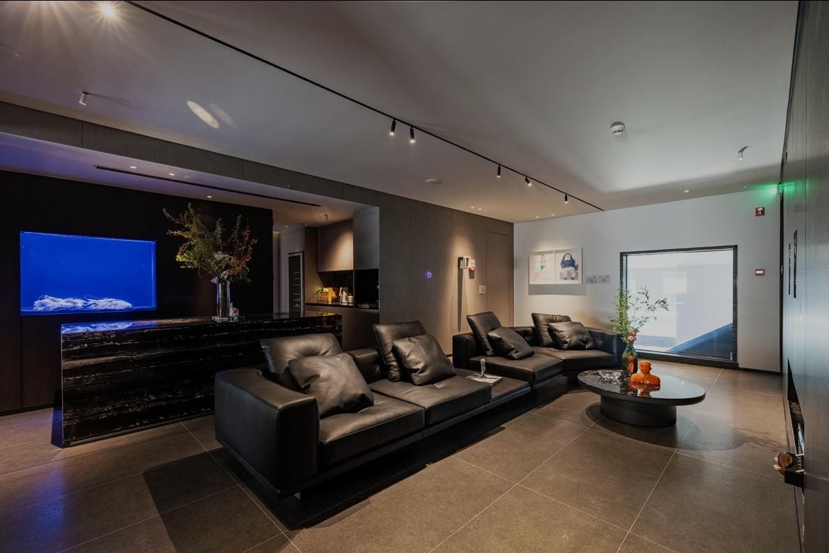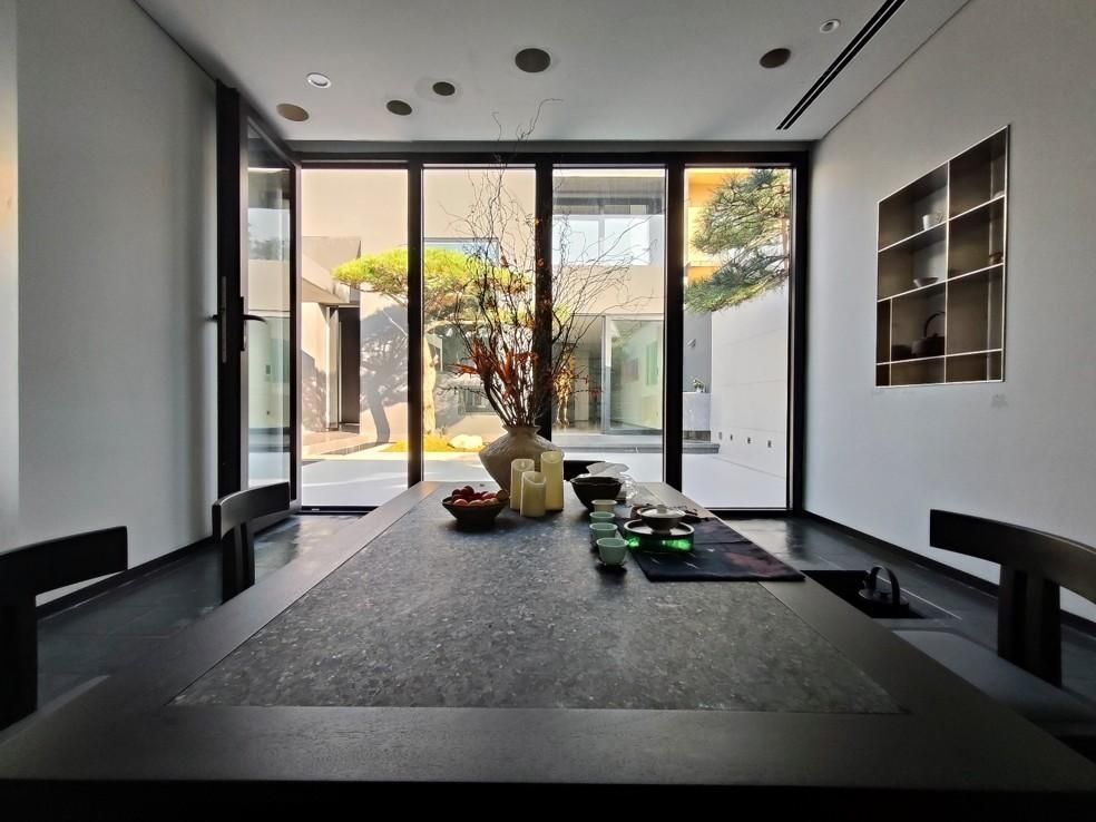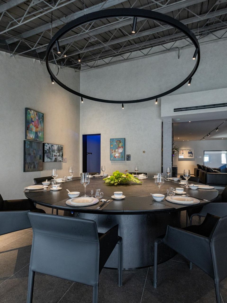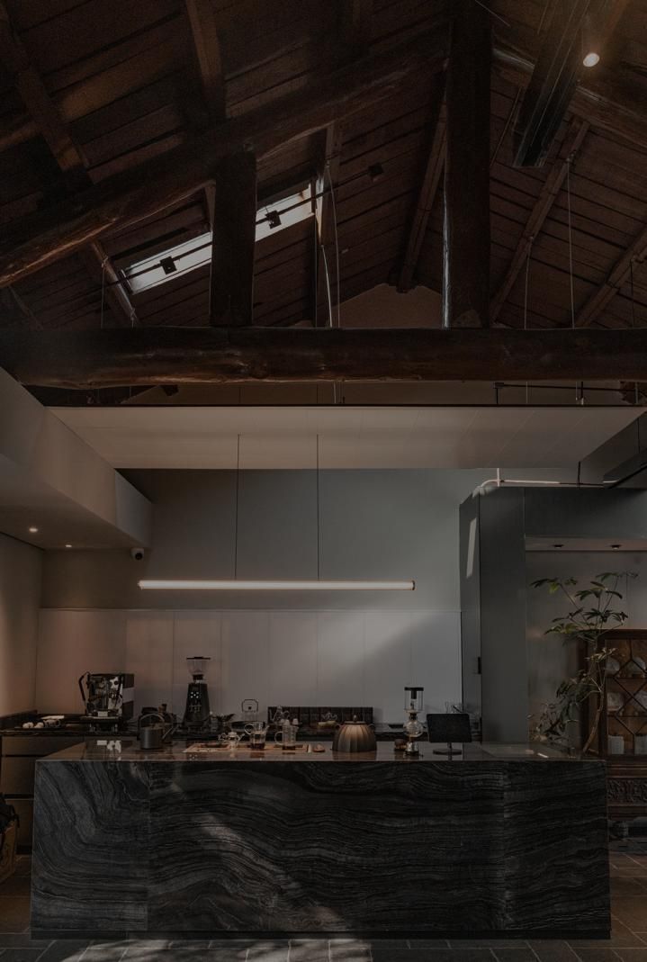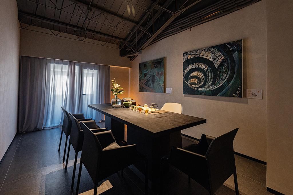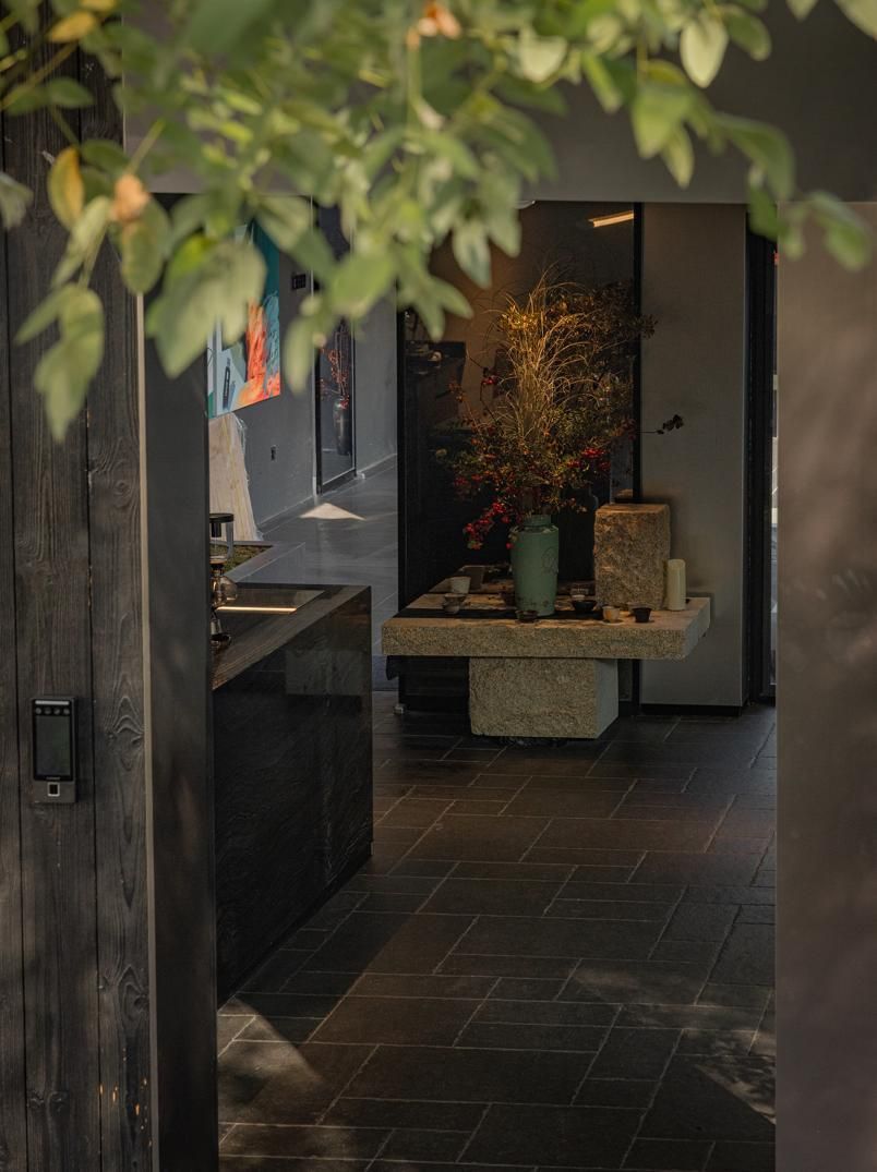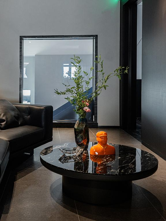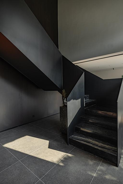 空间以500㎡极简黑调建筑,兼容艺术与商务,是城市中的静谧高地,三层立体结构串联前院、前厅、露天水系中庭与顶层露台,黑色之字形钢板楼梯贯穿空间动线,形成完整空间序列。