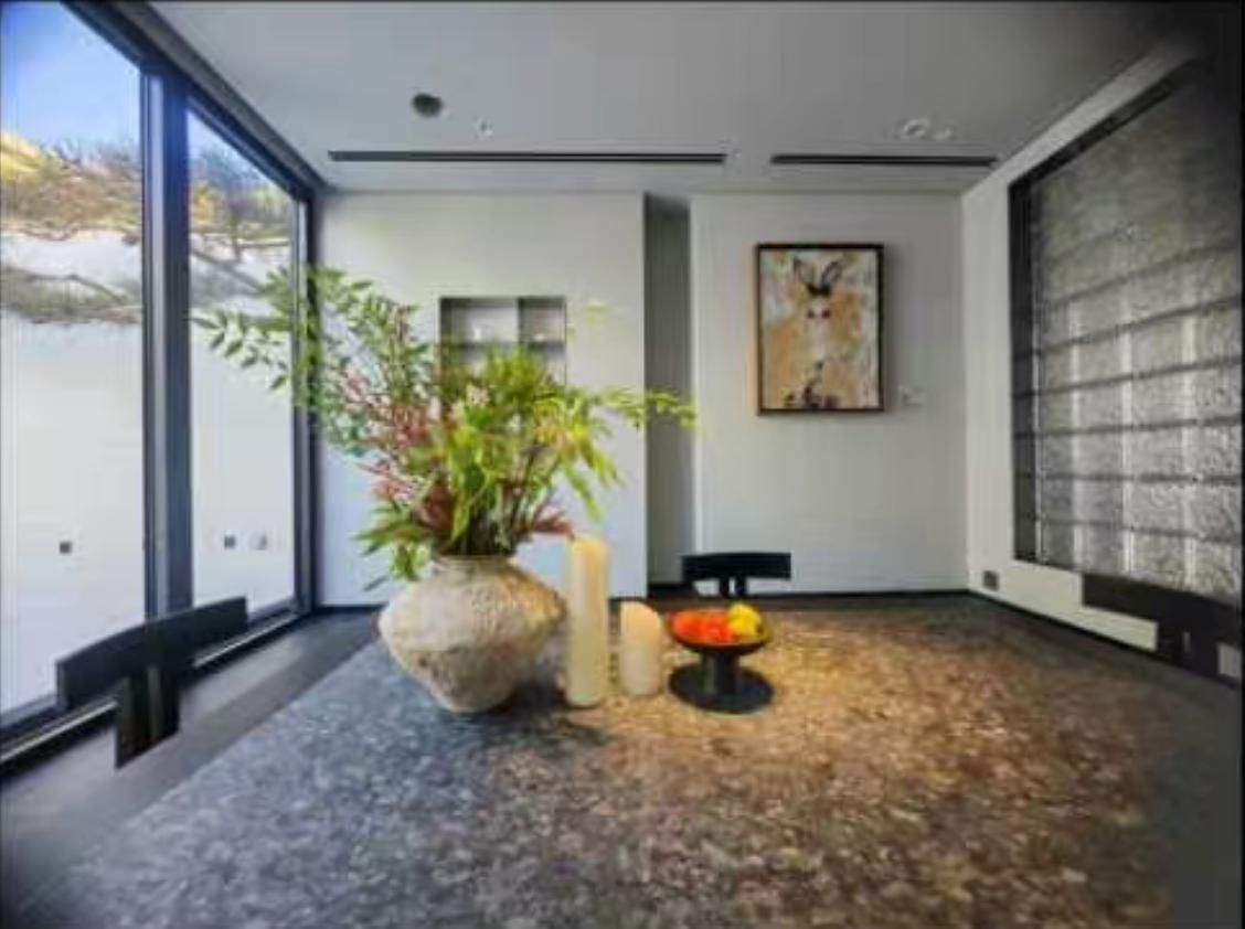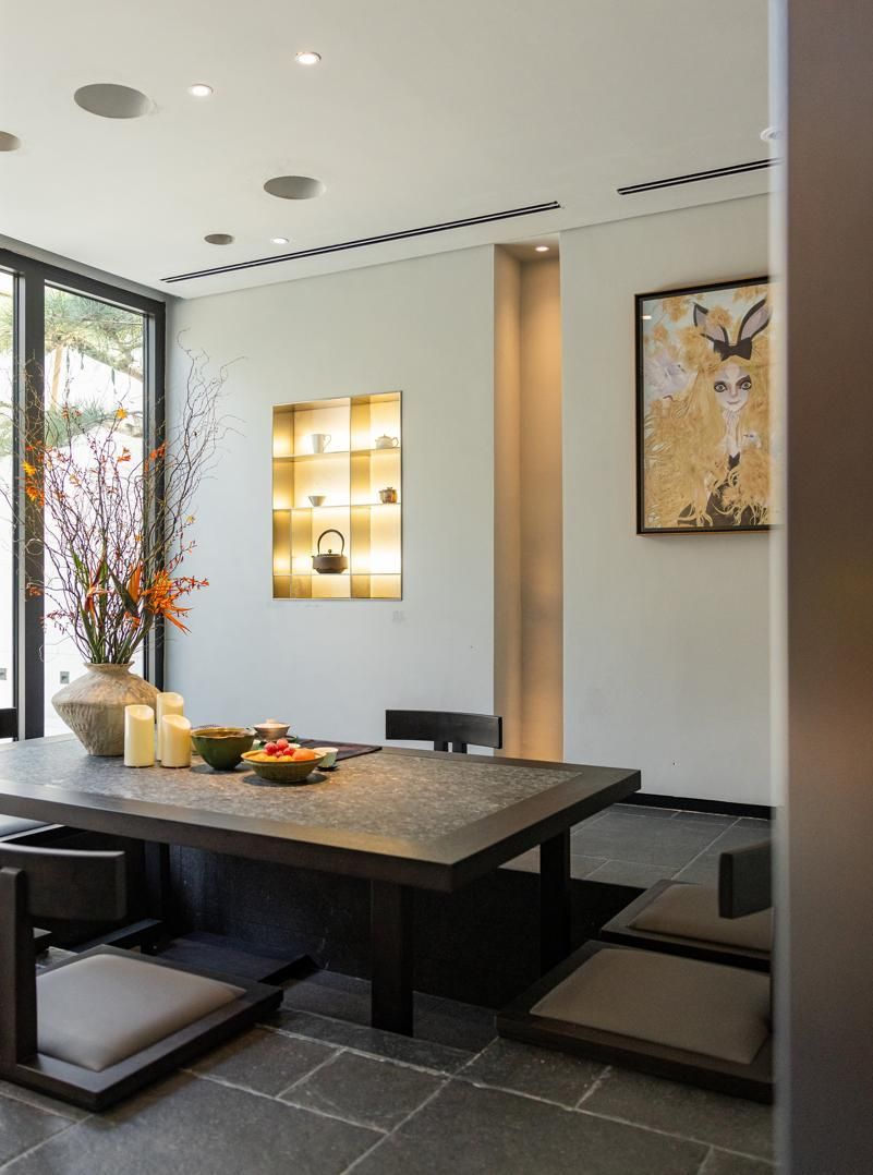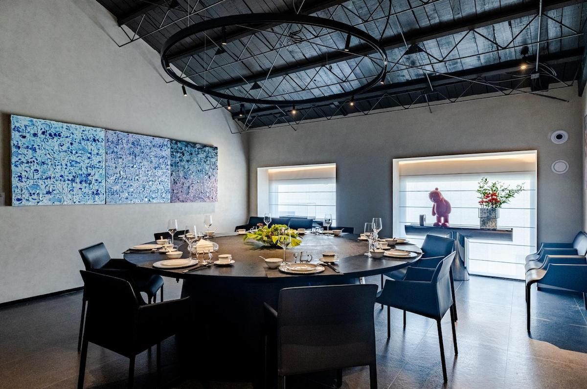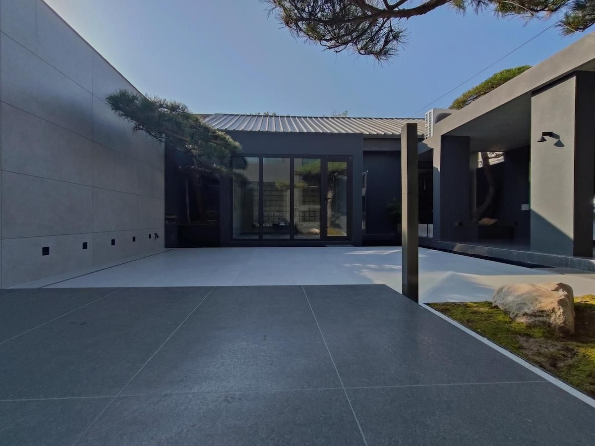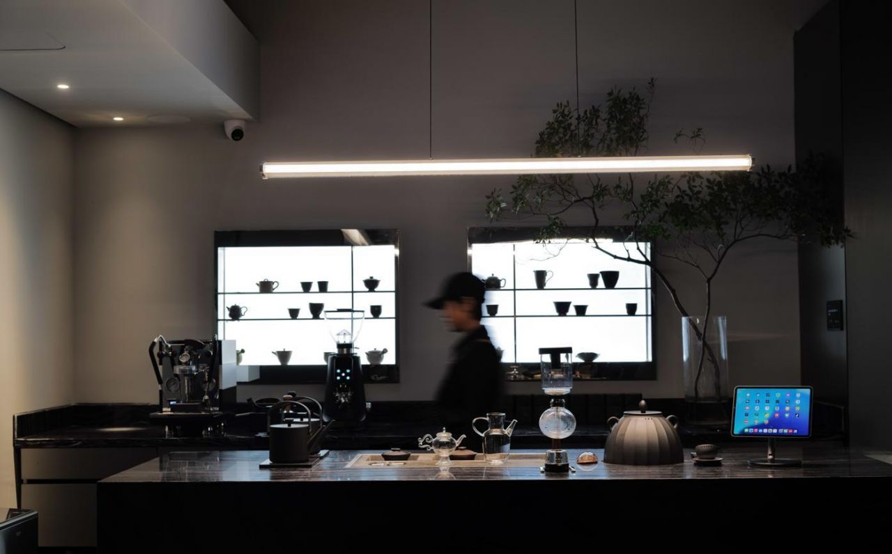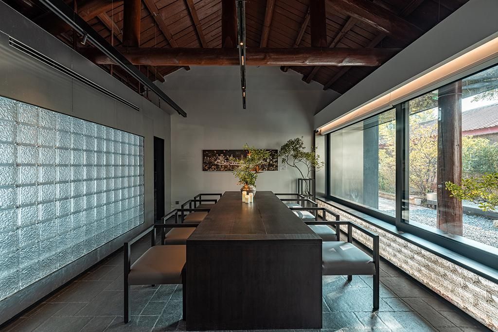 空间以500㎡极简黑调建筑,兼容艺术与商务,是城市中的静谧高地,三层立体结构串联前院、前厅、露天水系中庭与顶层露台,黑色之字形钢板楼梯贯穿空间动线,形成完整空间序列。