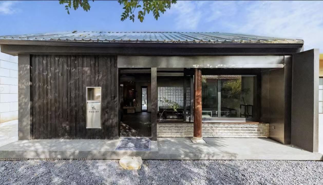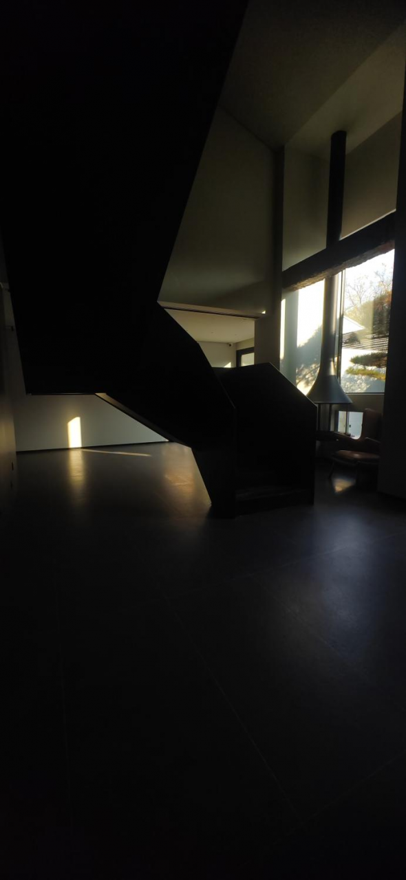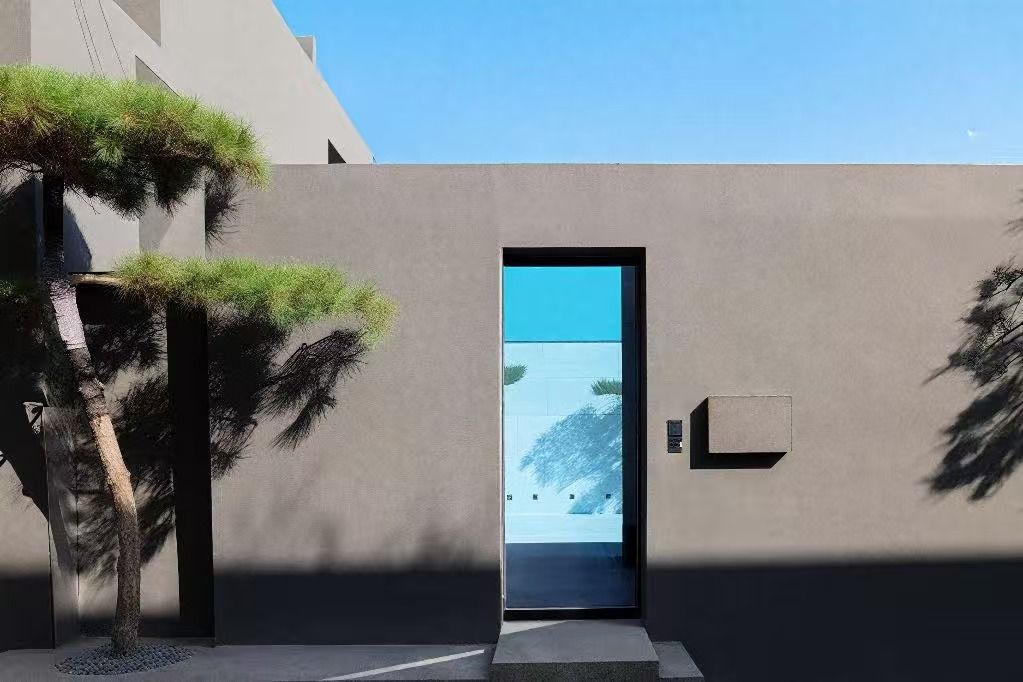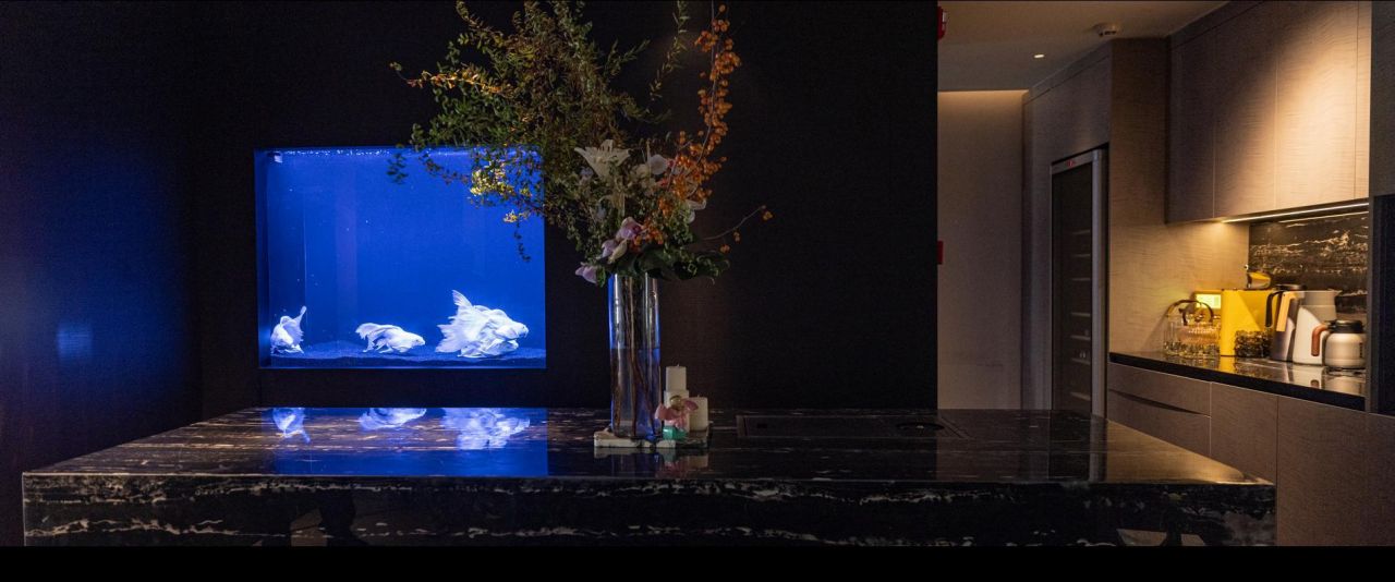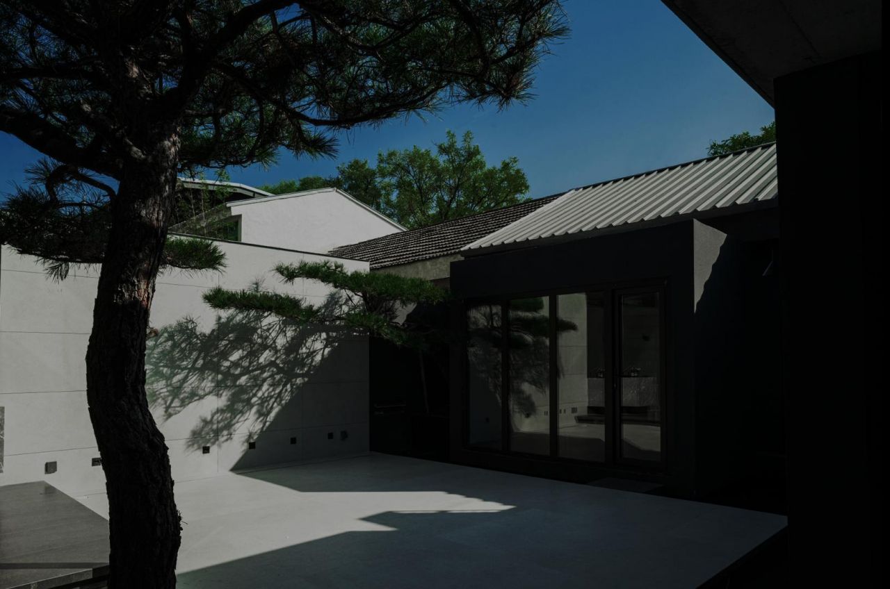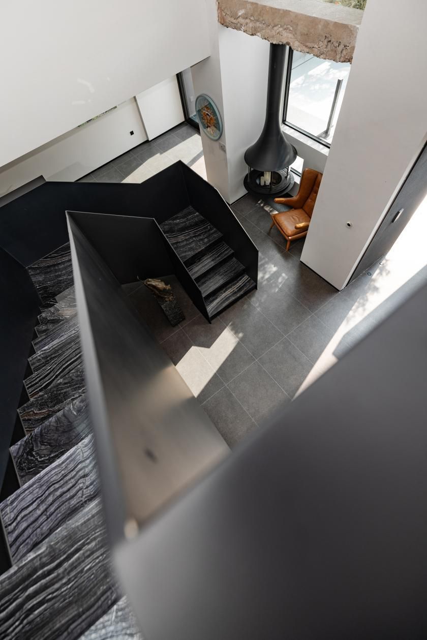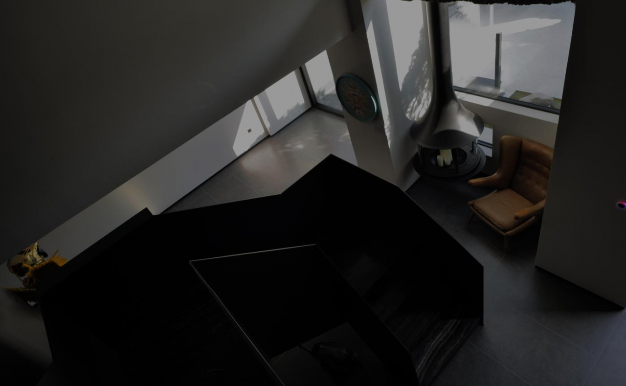 空间以500㎡极简黑调建筑,兼容艺术与商务,是城市中的静谧高地,三层立体结构串联前院、前厅、露天水系中庭与顶层露台,黑色之字形钢板楼梯贯穿空间动线,形成完整空间序列。