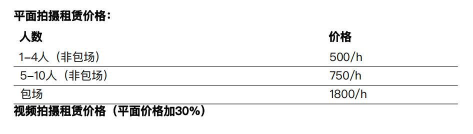 9. 视频判定规定:专业视频灯光组/摇臂轨道或其他大型影视设备/超过4k影视灯2盏,以及非包场客户需要超2h收音,都按视频费用算。
