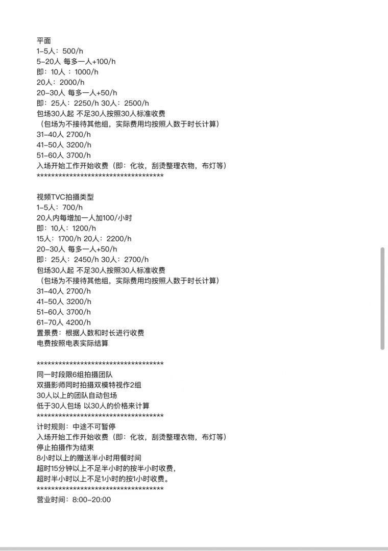 2:4K及以上灯光功率或有任何大型设备均按视频组拍收费标准计费。