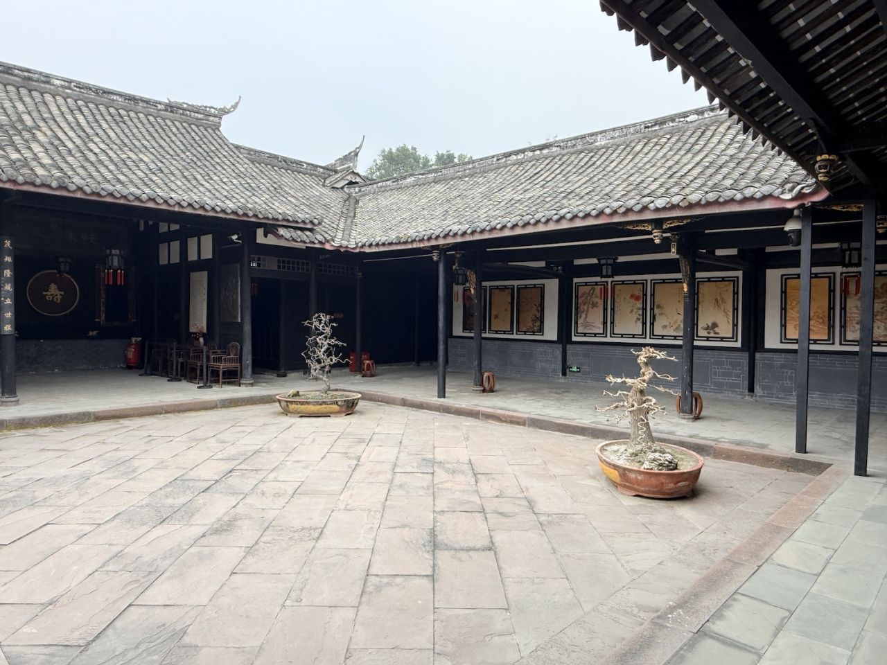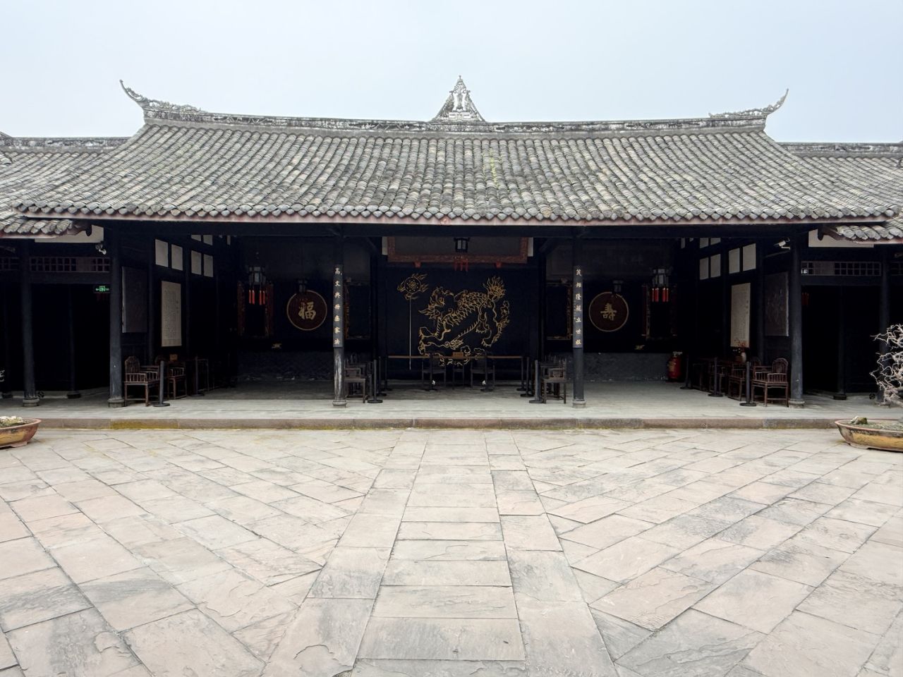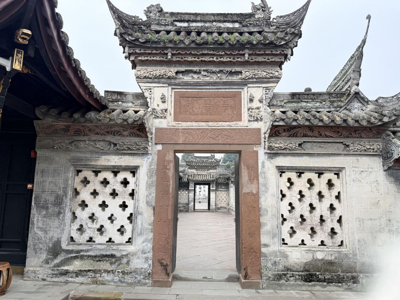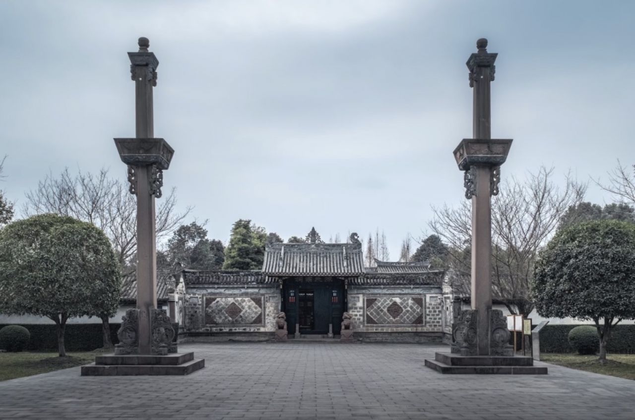 一座具有川西民居典型风格的综合性庭院式古建筑群,大院占地面积约15亩,建筑面积3000余平方米,共有大小院落12个。建筑分为三组,坐西朝东,中间向东西延伸分别建有大厅、堂屋、祭台,并在两侧分布寝室与议事厅;北面建有祠堂与私塾,南面建书房与上客厅。