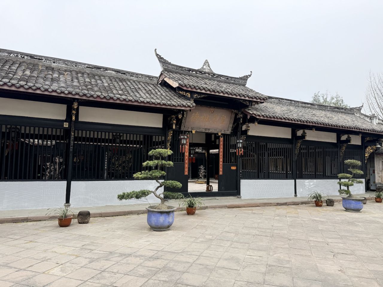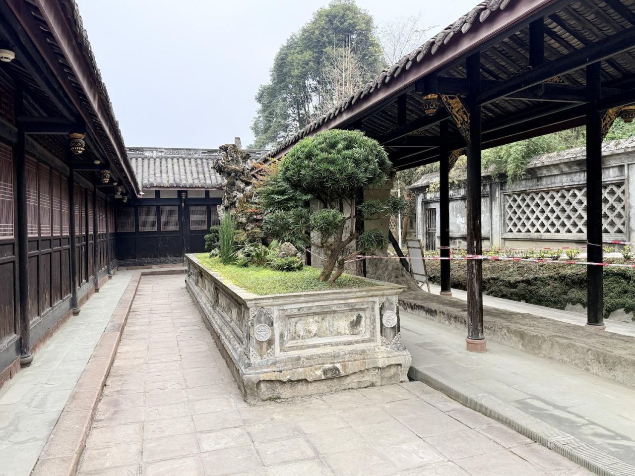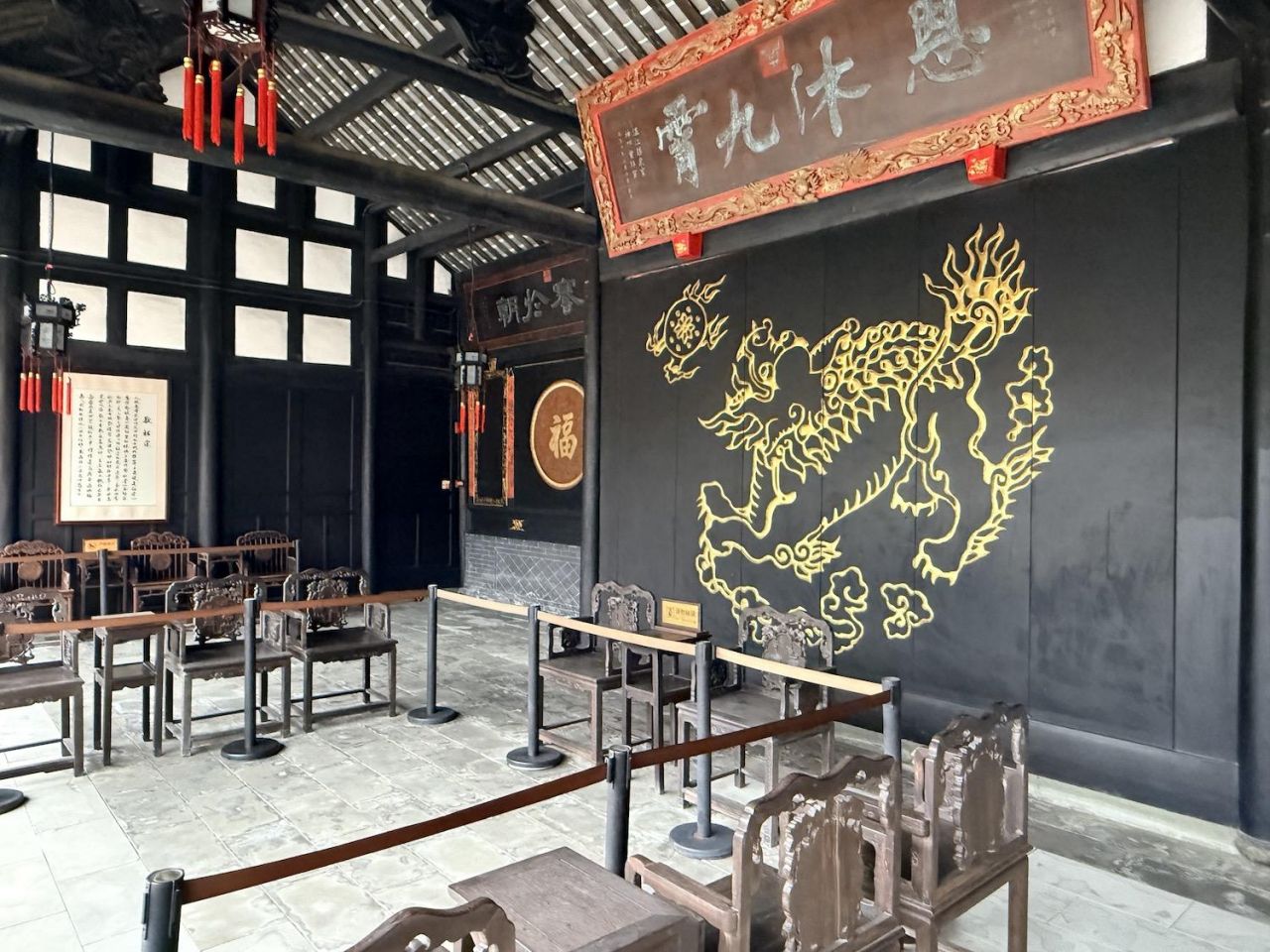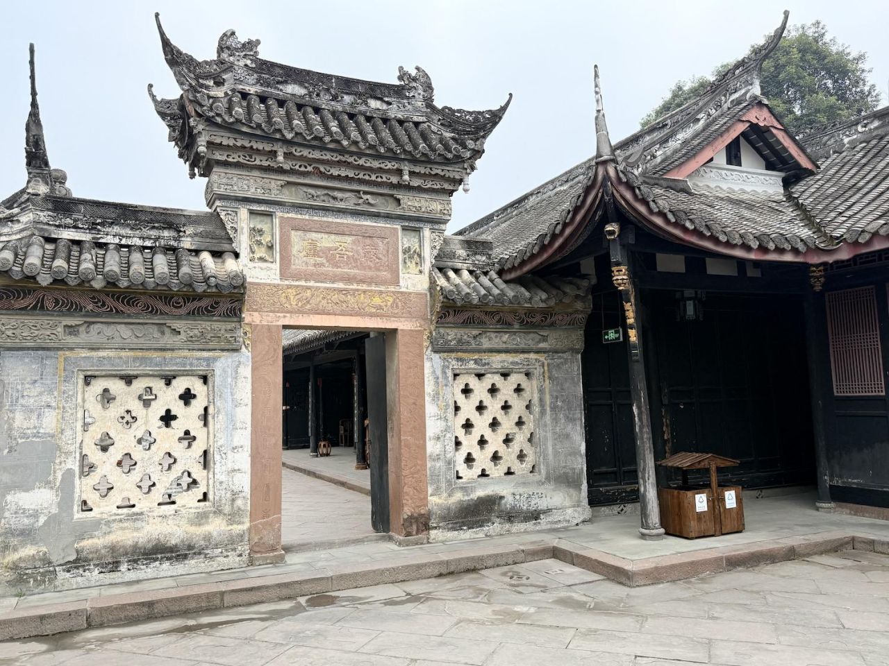 一座具有川西民居典型风格的综合性庭院式古建筑群,大院占地面积约15亩,建筑面积3000余平方米,共有大小院落12个。建筑分为三组,坐西朝东,中间向东西延伸分别建有大厅、堂屋、祭台,并在两侧分布寝室与议事厅;北面建有祠堂与私塾,南面建书房与上客厅。