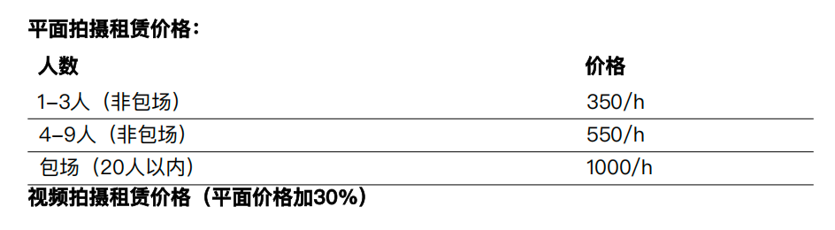 8. 如不包场或者短时间拍摄的客户提前2-3天开放预定,6h以上或者需要包场拍摄不受限制。预约以交付定金为准,拍摄至少前一天需预付所有租金,定金转为押金,根据最终拍摄时长结算,多退少补,如有账期需求请签订合同。